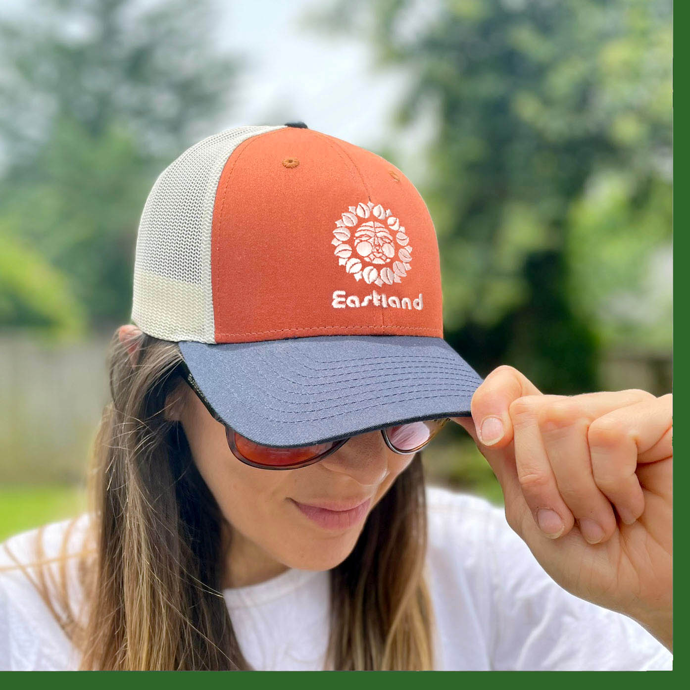 LOW PRO TRUCKER HAT NOW WITH MORE EASTLAND! • Medium/Large 7″- 7 3/4″ • Cotton/Polyester Twill Fabric, Trucker Mesh • Structured, Six-panel, Low Pro Profile • Pre-curved Bill • Adjustable Snapback Closure